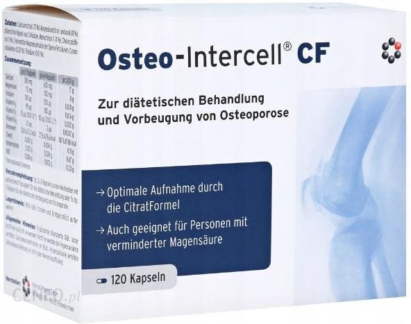 Osteo-Intercell CF® zawiera wapń, magnez, witaminę D oraz K2, które wspomagają utrzymanie zdrowych kości.Preparat Osteo-Intercell CF® został wzbogacony o witaminę B12 i kwas foliowy, które przyczyniają się do utrzymania prawidłowego metabolizmu homocysteiny.Wapń w formie cytrynianu wapnia zapewnia absorpcję tego minerału niezależne od stężenia kwasu żołądkowego.Osteo-lntercell CF® zawiera naturalną witaminę K2 w formie menachinonu-7.Stężenie składników odżywczych zostało dostosowane w taki sposób, aby mogły one wzajemnie uzupełniać swoje działanie.Składniki preparatu zamknięte są w innowacyjnej kapsułce, która składa się wyłącznie z roślinnej celulozy oraz wody – bez dodatku środków mogących zakłócić działanie substancji aktywnych.Preparat został utworzony zgodnie z zasadami GMP – gwarancja najwyższej jakości i czystości produktu.Skład:węglan wapnia, tlenek magnezu, substancja glazurująca: hydroksypropylometyloceluloza, substancja wypełniająca: celuloza mikrokrystaliczna, menachinon-7 (witamina K), cholekalcyferol (witamina D), cyjanokobalamina (witamina B12), kwas pteroilomonoglutaminowy (kwas foliowy), substancja przeciwzbrylająca: sole magnezowe kwasów tłuszczowych. Produkt bezglutenowy. Nie dodano środków aromatyzujących. Nie występują składniki alergenne. Zalecana porcja dzienna: 2 kapsułki Zalecana dzienna porcja (2 kapsułki) zawiera: * Wapń – 640 mg = 80% RWS * Magnez – 150 mg = 40% RWS * Kwas foliowy – 200 µg = 100% RWS * Witamina K – 45µg = 60% RWS * Witamina D – 50 µg (2000 I.U **) = 1000% RWS * Witamina B12 – 3 µg = 120% RWS *RWS – Referencyjna Wartość Spożycia ** I.U. – jednostki międzynarodowe Sposób użycia:2 razy dziennie (rano i wieczorem) po 1 kapsułce, w trakcie posiłku. Nie należy przekraczać zalecanej porcji do spożycia w ciągu dnia. Suplement diety nie może być stosowany jako substytut zróżnicowanej diety. Należy przestrzegać zdrowego trybu życia i zrównoważonego sposobu żywienia. Nie stosować w przypadku nadwrażliwości na składniki preparatu.UWAGA: Preparatu nie stosować w przypadku występowania: hiperkalcemii, hiperkalciurii stanu zapalnego nerek, nefropatii. Przy zalecanej porcji dziennej nie wykazano wzajemnego oddziaływania z terapią antykoagulantami (np. Marcumar). Przechowywanie:Przechowywać w sposób niedostępny dla małych dzieci. Przechowywać zamknięte, w suchym, chłodnym miejscu. Chronić przed światłem. Opakowanie: 120 kapsułekWyprodukowane w Niemczech przez:INTERCELL Pharma GmbHAltlaufstrasse 42 D – 85635 HöhenkirchenDeutschland dla MITO-CELLDOROTA KRAWCZYKSikorskiego 2266-400 Gorzów Wlkp.www.mito-cell.pl